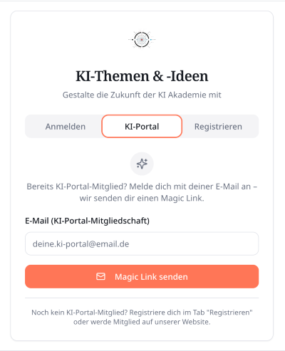 Login wie hier im KI-Portal. Wenn du noch keinen Zugang hast, kannst du dich registrieren – und bist automatisch auch kostenlos im KI-Portal mit angemeldet.